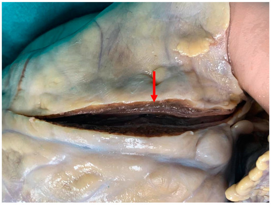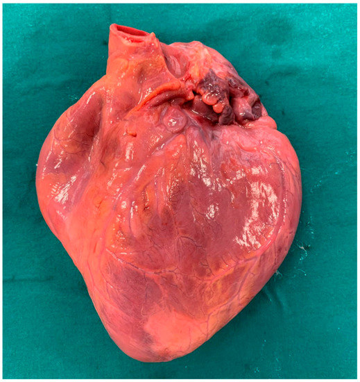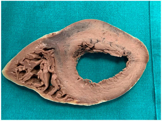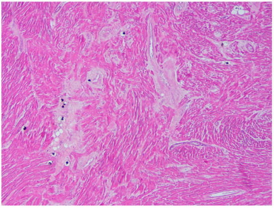 A 20-year-old young man (body mass index: 28) suddenly died in a public place. The friend who witnessed his death declared that he had recently smoked cannabis. All the witnesses said that the young man appeared in good health and that he suddenly collapsed (without any previous symptom). Basic life support maneuvers were promptly started, but when paramedics arrived, he was asystolic at ECG. The public prosecutor requested an autopsy to find the cause of the death. The victim played several competitive sports and had a syncope while playing football three years before. At external examination of the body no relevant sign was found. At the autopsy, performed five days after the death, the heart was isolated and fixated in toto in a 10% buffered formalin-based solution (Figure 1 and Figure 2). Both the lungs appeared swollen (weights: left—450 g, right—940 g), and multiorgan congestion was observed. Heart examination (weight: 530 g, longitudinal diameter: 11 cm, transverse diameter: 13 cm) presented no anomaly. Atria, valves, left ventricle (anterior wall thickness: 1.3 cm; lateral wall thickness: 1.4 cm; posterior wall thickness: 1.7 cm; interventricular septum thickness: 1.5 cm) and right ventricle (wall thickness: 0.5 cm) did not show any macroscopic relevant finding. Coronary circulation was right dominant. Left anterior descending coronary artery presented, at 2 cm from its beginning, a 0.3-cm-thick 5.5-cm-long myocardial bridging (Figure 3). Other coronary arteries were macroscopically normal. The conduction system was carefully analyzed, and serial sectioning targeted blocks of areas of interest [12,13]. Histopathological examination of the myocardium (Figure 4) found wavering of myocardial fibers, fibrosis and disarray in the left ventricle myocardial area above the MB (Figure 5); fibrosis in sino-atrial node area (Figure 6) and infiltration of fatty tissue (separated the myocardium) in the antero-lateral region of right ventricle free wall (Figure 7). The atrio-ventricular node presented no microscopic anomalies. No signs of myocarditis were found.