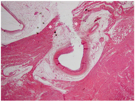 Histopathological image of myocardial bridging: the two parts of the myocardial bridge (disrupted by the coronary dissection) are indicated by white asterisks (Hematoxylin and eosin stain, 10× magnification).