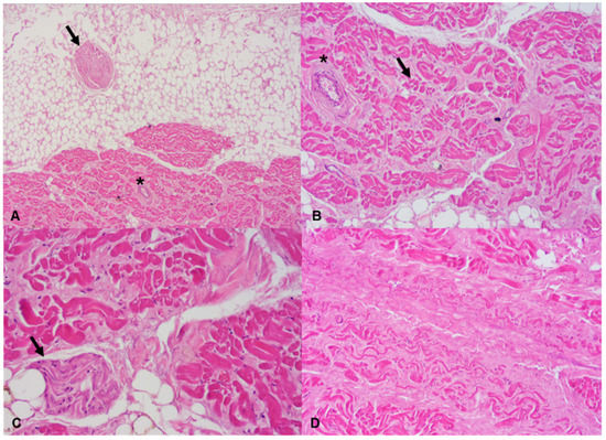 Sino-atrial node: (A) sections of a nerve fiber (arrow) near the sino-atrial node and of a branch of the artery of the sino-atrial node (asterisk) (Hematoxylin and eosin stain, 40× magnification); (B) section of a branch of the artery of the sino-atrial node (asterisk). A group of pacemaker cells is indicated by an arrow (Hematoxylin and eosin stain, 100× magnification); (C) section of a nerve fiber (arrow) running into the sino-atrial node (Hematoxylin and eosin stain, 200× magnification); (D) fibrosis of the sino-atrial node can be clearly seen (Hematoxylin and eosin stain, 100× magnification).