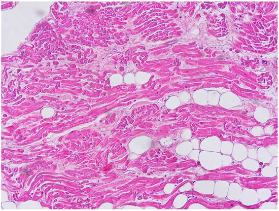Fatty tissue inside the myocardium in the antero-lateral region of right ventricle free wall (Hematoxylin and eosin stain, 400× magnification).