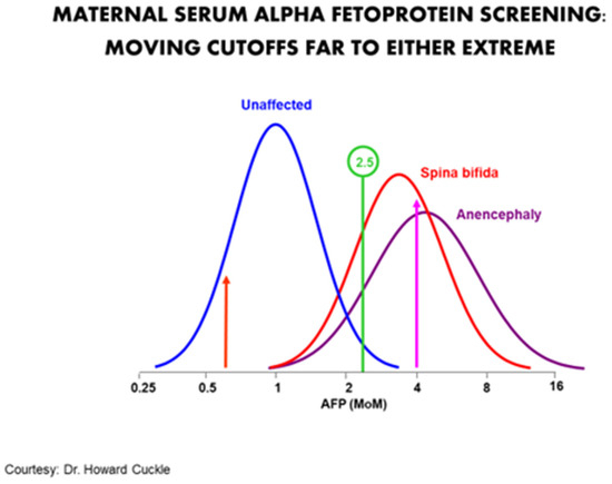 - Wald, N.; Cuckle, H. Amniotic fluid alpha-fetoprotein measurement in antenatal diagnosis of anencephaly and open spina bifida in early pregnancy. Lancet 1979, 1, 685–688. [Google Scholar] [CrossRef]