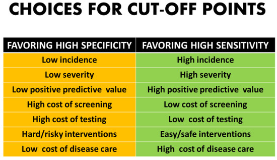 Even getting past technical, financial, implementation issues, and quality controls, there are still philosophical issues that drive the determination of a cut-off point. The more serious the disorder, the more likely that any typical patient’s “tolerance” for missing a case would be very low [45,46]. This would create an impetus to put the cut-off point “to the left” on the distribution curve which would maximize sensitivity at the expense of increased false positives. Likewise, with disorders with a very low incidence or those in which morbidity and mortality might be moderate, it would be reasonable to move the cut-off to the right to minimize the number of patients undergoing follow-up diagnostic procedures [1,2,3] (Figure 2).