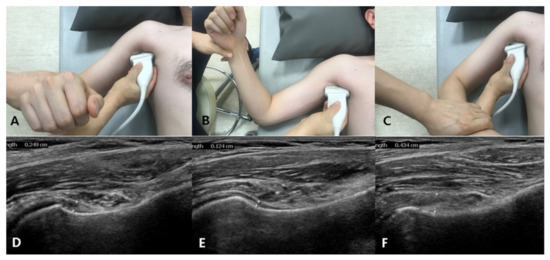 Arm positions and ultrasonography (US) measurement of inferior joint capsule (IJC) thickness. (A) Neutral position. (B) Externally rotated position. (C) Internally rotated position. (D–F) US measurement of IJC thickness according to arm position.