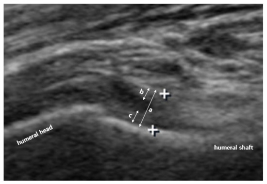 Ultrasonographic measurement of inferior joint capsule (IJC) thickness. IJC thickness was defined as the distance from the cortex of the humerus to the outer margin of the capsule at the widest portion of the capsule. IJC thickness (a) includes both the glenoid side (b) and humeral side (c).