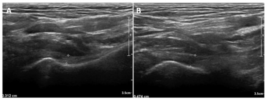 An illustrative case with unilateral frozen shoulder demonstrating the difference in inferior joint capsule (IJC) thickness in neutral position. (A) IJC thickness of the unaffected side. (B) IJC thickness of the affected side.