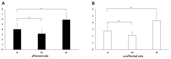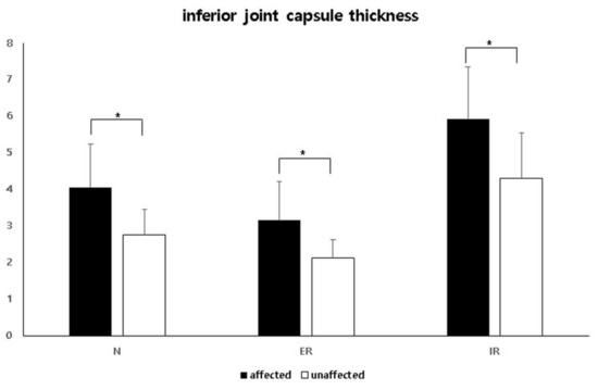Comparison of the inferior joint capsule thickness between the affected and unaffected shoulders in three different positions. N, neutral position; ER, externally rotated position; IR, internally rotated position. * Statistically significant.