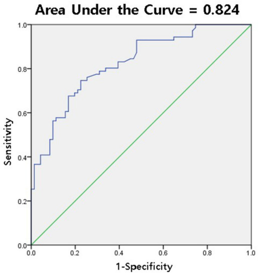 Receiver operating characteristic curve and area under curve (AUC) of inferior joint capsule thickness on ultrasonography in the neutral position for the diagnosis of frozen shoulder (AUC = 0.824).