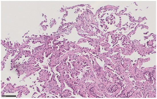High power (21x) hematoxylin and eosin view of a bronchoscopic transbronchial pulmonary sample in the same patient, showing primary lung adenocarcinoma with lepidic non mucinous and acinar patterns.