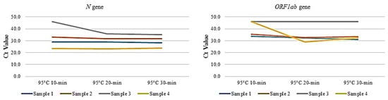 24], and thus, our aim was to optimize the duration of the temperature treatment by subjecting four previously characterized positive saliva samples to 95 °C for 10, 20, and 30 min followed by homogenization. Of the four samples, the Ct values for IC,