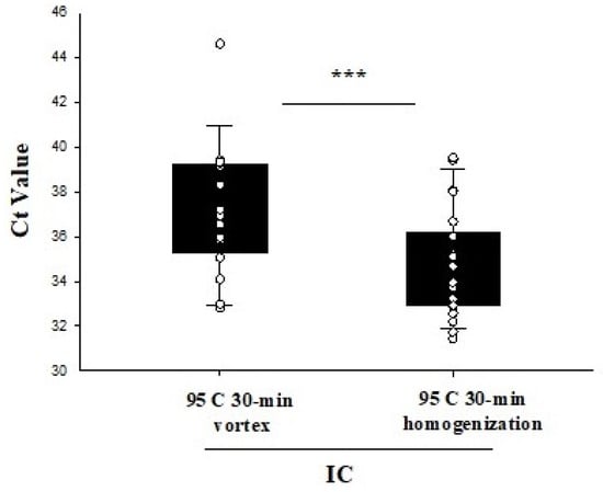 ORF1ab gene remained undetermined at 10 min intervals, whereas it was comparable at 20 and 30-min intervals, respectively. Thus, a 30-min incubation time was deemed optimal for further experiments, as, in addition to comparable Ct value results, the 30-min interval would inactivate the virus rendering it safe to process in clinical and nonclinical laboratories around the globe. The importance of homogenization of saliva samples after the 30-min incubation at 95 °C, was evident from the significantly lower Ct values for IC,