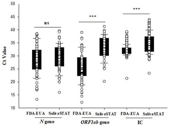 ORF1ab and IC were significantly higher with SalivaSTAT compared to the FDA-EUA method. These results are in alignment with previously published reports on heat-inactivated direct PCR assay using NPS samples, where comparable Ct values were observed for the N1 gene compared to other targets (E and ORF). Heat treatment cleaves the RNA into short fragments and the best results are obtained with the N1 gene primers, as reported previously [