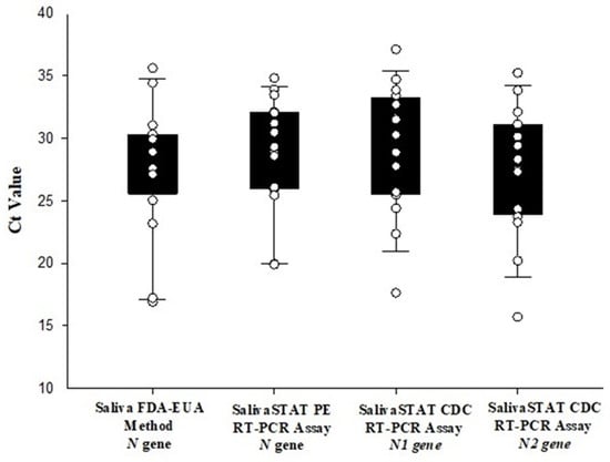 N gene with the SalivaSTAT protocol was comparable to that of the FDA-EUA method. The Ct value for
