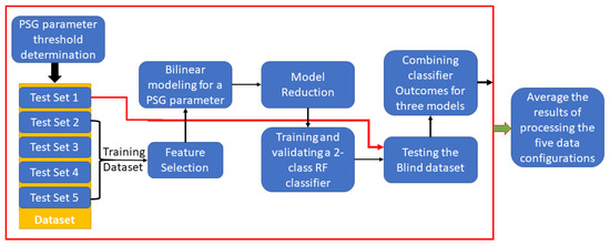 Breathing sound signals are stochastic signals in nature, and the OSA disorder has many confounding factors that affect breathing sounds, which increases the heterogeneity and complexity of data. Therefore, it is required to have a classification process with multiple thresholds for each feature to overcome the complexity and heterogeneity; such a classification approach is possible in the random-forest (RF) algorithm [26]. In addition, RF does not require a normality assumption. Therefore, a classification process was performed using a two-class RF classifier with 1200 iterations using the selected threshold and the selected models. For each iteration, the classifier used 65% of the training/validation data for training and the other 35% for validation. Then, the validated classifier was used to classify the blind testing dataset. The input for the classifier was the predicted PSG parameter using the evaluated bilinear model; thus, it was a one-feature RF classifier. The models (three-, four-, five-feature combinations) that provided the validation and testing accuracies ≥70% and validation and testing sensitivities and specificities ≥50% were selected as the best models. Then, we combined the classifier outcomes of three models to find the best combinations covering most of the dataset while providing the highest classification performance. The final classification was based on the majority voting of each individual classifier; see [25] for more details on this section. The classification process was separately applied on the five data configurations, and then their results were averaged for each PSG parameter separately.