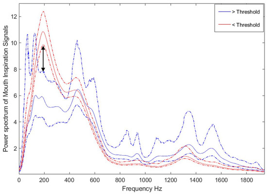 The average power spectrum of the signal recorded from mouth inspiration. Dotted lines represent the 95% confidence interval. Red and blue color curves represent the groups with more and less than a threshold, respectively. The arrow shows a large gap beyond the confidence interval between the two groups.