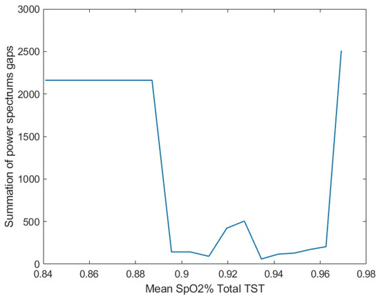 Figure 3 shows an example of the gap values for different thresholds for a PSG parameter (i.e., the mean SpO2% during total TST); thresholds <92% or >95% had high average gap values, but the number of individuals per group was less than 20. The physiological meanings for different PSG parameters were discussed in the literature, in particular, the percentage of stages III and REM of sleep [18], total arousal index [19], mean SpO2% [20], and oxygen desaturation (de-SpO2) index [21].