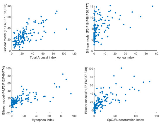 Table 4 shows the bilinear model feature combinations with the highest overall correlation coefficients with the PSG parameters. Only the highest two model coefficients are represented in parentheses right to the relevant feature, and the bolded feature is the one with the highest contribution to the constructed model. Furthermore, F1 scores and testing classification accuracies of the blind testing dataset using the corresponding models to predict the PSG parameters are presented. The constructed models had correlation coefficients >0.8 with nine OSA severity parameters. The supine arousal index had a correlation coefficient of 0.8 with the F5-F6-F37-F46-F74 bilinear model, and the average power of high frequencies for the nose inspiratory signal was the main parameter in the bilinear model. The hypopnea index had a correlation coefficient of 0.82 with the F4-F5-F12-F26-F38 bilinear model, and neck circumference was the main parameter in the bilinear model. The testing classification accuracy and F1 score were 92% and 95%, respectively, for predicting AHI measured in the supine position with a threshold of 15. The scatter plots of the four previously mentioned PSG parameters with their highly correlated bilinear equation models are shown in Figure 5. These plots show the enhancement in correlation coefficients and linear relationships compared to those shown in Figure 4.