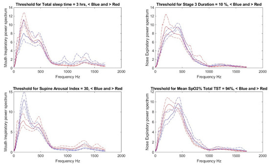 Figure 6 shows the average inspiratory/expiratory power spectra during mouth/nose breathing of four PSG parameter groups. The corresponding sound spectra to each PSG parameter are represented using two curves (i.e., blue and red) with their 95% confidence intervals (dotted lines). The blue curve represents the average curves of individuals with the PSG parameters less than the selected threshold, while the red curve represents the average curves of individuals with the PSG parameters more than the selected threshold. There is a big gap in the range of 100–300 Hz between the mouth inspiratory power spectra of patients with a supine arousal index of more than 30 and less than 30.