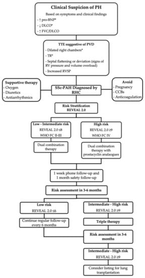 Screening, diagnostic, and treatment algorithm for systemic sclerosis-associated pulmonary arterial hypertension (SSc-PAH) used in the Johns Hopkins Pulmonary Hypertension Program. Variables based on the * DETECT algorithm, including cutoffs for referral for RHC, and REVEAL risk stratification scoring system to guide therapeutic management. Abbreviations: pro-BNP, pro brain natriuretic peptide; DLCO, diffusing capacity for carbon monoxide; FVC, forced vital capacity; TTE, transthoracic echocardiography; PVD, pulmonary vascular disease; TR; tricuspid regurgitation; RVSP; right ventricular systolic pressure; RHC, right heart catheterization; WHO FC, World Health Organization Functional Class [16,49,50].