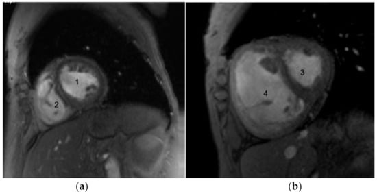 Cardiac MRI image showing: (a) normal left ventricle (LV) (1) and right ventricle (RV) (2) chambers in contrast with (b) an abnormal LV septal flattening with small LV chamber (3) and associated enlarged RV (4), which are suggestive of elevated right heart volume and pressure, which is typical in the setting of PAH.