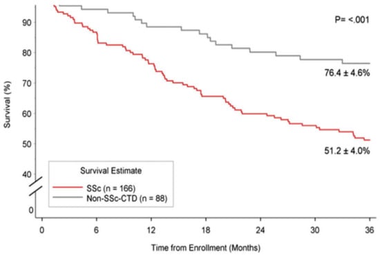 Kaplan–Meier three-year survival curves comparing patients with SSc-PAH (SSc) vs. PAH associated with connective tissue disease (CTD-PAH) (non-SSc-CTD) among participants enrolled in the REVEAL registry. Figure reproduced with permission from Elsevier, Chung et al., Chest (2014) 146(6):1494–1504 [110], Open access content.