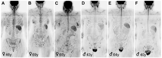 High b-value (b = 900 s/mm2) inverted gray-scale coronal maximum-intensity-projection images of 6 asymptomatic individuals. (A) In our cohort, the bone marrow signal intensity of women (♀) aged between 30 and 50 was higher compared to the bone marrow signal of older women (B) and adult men (♂) of all age groups (D,E). This difference may be attributable to the higher cellularity, water content and possibly higher perfusion of pre-menopausal women bone marrow. Images (C,F) show two examples of individuals for which the semi-automatic segmentation method used in this study was not applicable, due to hypointense bone marrow signal intensity on high b-value inverted gray-scale coronal maximum-intensity-projection images.