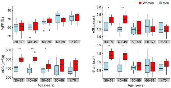 Comparing women and men in the separate age groups, %FF values of men and women were not significantly different in any of the age groups (p = 0.256). On the contrary, the values of nSIb50 and nSIb900 were significantly different between men and women in the 30–39 years (p = 0.017 and p = 0.003, respectively) and the 40–49 years (p = 0.003 and p = 0.001, respectively) age groups. Finally, the sex difference in the ADC values was significant for the three younger groups (p < 0.001, p < 0.001, and p = 0.017, respectively), but not for the 60–69 and ≥70 age groups (Figure 3).