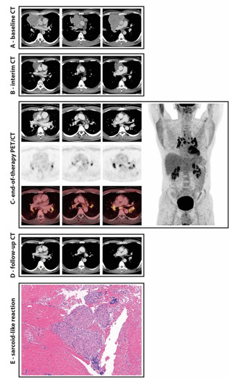 The sarcoid-like reaction represents an autoinflammatory cause of mediastinal and hilar lymphadenopathy [1,2]. This rare phenomenon has mainly been reported in patients with solid tumors undergoing immunotherapy (particularly in those with melanoma), but can also be seen in patients treated with chemotherapy [3,4,5,6]. In addition to the involvement of regional lymph nodes, a sarcoid-like reaction can also affect distant lymph node regions or organs such as the lung, spleen, bone marrow, and skin [7,8]. Rare cases of sarcoid-like reactions have been reported in patients with HL [9,10,11]. Cases of sarcoid-like reactions in patients with NHL are less common [10,11,12]. Some authors propose the concept of a lymphoma-sarcoidosis syndrome, in which patients have a coexistence of sarcoidosis and lymphoma, particularly HL [13]. A study comparing the prognosis of patients presenting with DLBCL with and without sarcoidosis showed no significant difference in overall survival and progression-free survival between the two groups [14].