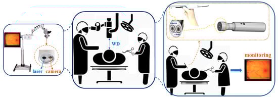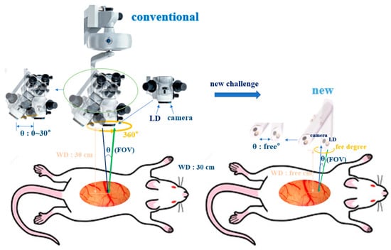 38], and the surgical microscope must be supplied with electrical energy from an outside source. Thus, it is not portable, and the size of the operating room narrows owing to the large size of the microscope. However, the irradiation of the maximum power of an LD is 19 mW, and the actual LD power is within 4 mW. The width and length of the microscopes in the study in [