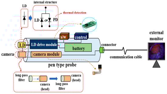In this paper, a small and portable pen-type probe was proposed. It comprises a laser diode, an endoscope camera, a brightness control device of a light source, a power supply, and a communication contactor. The pen-type probe can be connected to an external monitor using a cable. Therefore, it can be used to observe tissues from the outside by using a monitor.