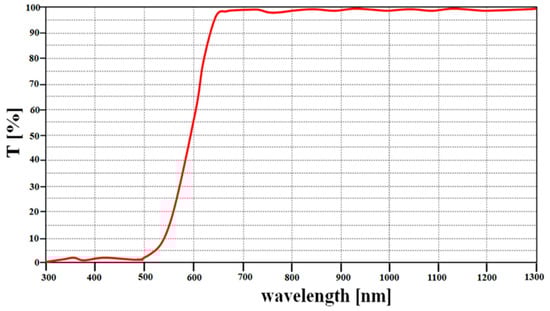Figure 5 shows that the cut-in wavelength, transmission (T), and reflection (OD: optical density) were 600 nm, 98%, and 0.2%, respectively.