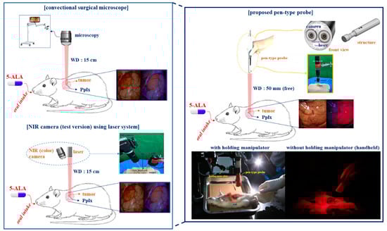 The conventional surgical microscope (with a laser diode (LD: Thorlabs DL-5146-101s) and near-infrared (NIR) camera: SE8J200) and the proposed pen-type probe are compared in