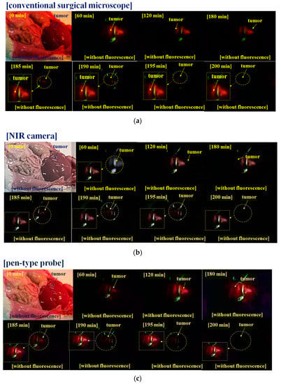 Figure 8 shows the state of the tumor removal (or extant) through 5-ALA fluorescence in malignant tumors. The fluorescence emission images of the tumor removal (or extant) were collected using a conventional surgical microscope, an NIR camera (test version) and an infrared camera (pen-type probe). The collected images were observed on a monitor through a cable.