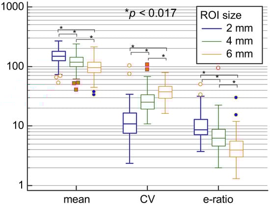Comparison of means, coefficients of variation and e-ratio values between 2 mm, 4 mm, and 6 mm ROI sizes.