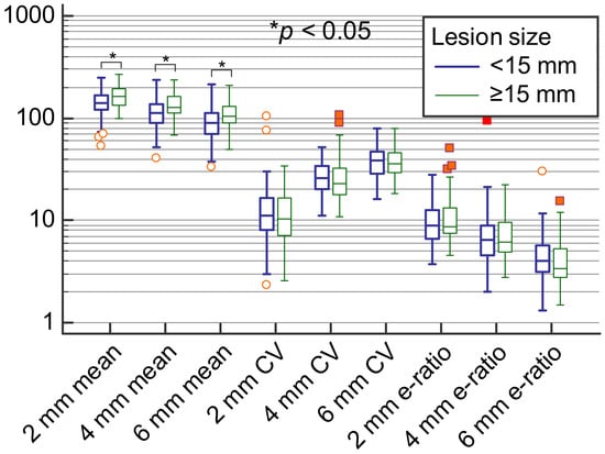 Means, coefficients of variation and e-ratio measurements for ROI 2 mm, 4 mm and 6 mm sizes stratified according to the lesion size.