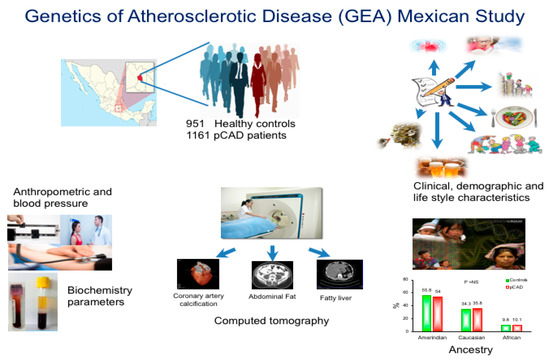 - Villarreal-Molina, T.; Posadas-Romero, C.; Romero-Hidalgo, S.; Antúnez-Argüelles, E.; Bautista-Grande, A.; Vargas-Alarcón, G.; Kimura-Hayama, E.; Canizalez-Quinteros, S.; Juárez-Rojas, J.G.; Posadas-Sánchez, R.; et al. The ABCA1 gene R230C variant is associated with decreased risk of premature coronary artery disease: The genetics of atherosclerotic disease (GEA) study. PLoS ONE 2012, 7, e49285. [Google Scholar] [CrossRef]
