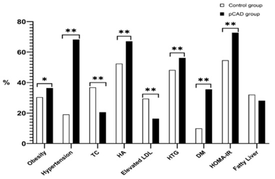 Cardiovascular risk factors’ prevalence in pCAD patients and controls is shown in Figure 2. As expected, the prevalence of obesity, hypertension, hypoalphalipoproteinemia, hypertriglyceridemia, diabetes, and insulin resistance were significantly higher in the pCAD patients (p < 0.001). In contrast, the control group showed a higher frequency of hypercholesterolemia and elevated LDL-c (p < 0.001).