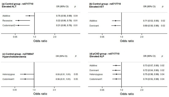 The association of the polymorphisms with cardiovascular risk factors, metabolic parameters, and levels of liver enzymes was evaluated independently in pCAD patients and healthy controls (Figure 4). In healthy controls, the rs6717710 polymorphism was associated with low risk of presenting elevated ALT (padditive = 0.04; precessive = 0.01; pcodominant2 = 0.01) and elevated AST (padditive = 0.02; pdominant = 0.02). A moderate association of the rs2708947 polymorphism with a low risk of hypercholesterolemia was observed (pheterozygous = 0.05; pcodominant1 = 0.05). On the other hand, in pCAD patients, the rs6717710 was associated with low risk of presenting elevated ALP (padditive = 0.02; pdominant = 0.02; pheterozygous = 0.04; pcodominant1 = 0.04). Models were adjusted by age, sex, BMI, diabetes, LDL-c, hypertension, and smoke.