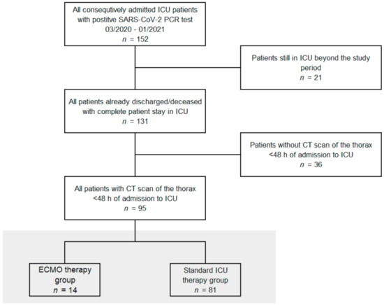 Study flow chart. All patients from the participating intensive care units (ICUs) with positive severe acute respiratory syndrome coronavirus 2 (SARS-CoV-2) polymerase chain reaction (PCR) test between 2nd of March 2020 and 26th of January 2021, who were discharged or deceased and received a computed tomography (CT) scan of the thorax on admission, were included. Extracorporeal membrane oxygenation, ECMO.