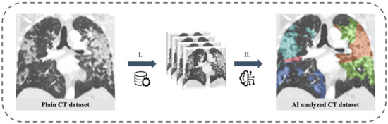 Lung involvement of CT scans of the thorax assessed with artificial intelligence. Left: Plain coronal slice image of the thorax CT scan in a patient with SARS-CoV-2 positive PCR test. Right: AI analyzed CT dataset with color staining of affected lung tissue (colored areas in each lung lobe). I. Pre-processing with data anonymization and uploading. II. AI-based analysis of CT dataset.