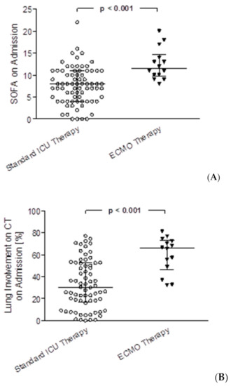 SOFA score on admission and lung involvement on admission CT scans assessed with artificial intelligence for COVID-19 patients with standard ICU therapy vs. ECMO therapy. (A) Comparison of SOFA scores on admission between patients with standard ICU therapy vs. ECMO therapy, p < 0.001 (B) comparison of lung involvement on admission CT scans between patients with standard ICU therapy vs. ECMO therapy, p < 0.001.