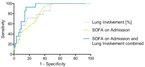 ROC curves for SOFA score on ICU admission, lung involvement on admission CT and both parameters combined for the prediction of subsequent ECMO therapy. ROC curve for assignment to ECMO therapy according to SOFA score on admission (yellow), AUC = 0.82 (95% CI 0.72–0.91), lung involvement in % of total lung volume (grey), AUC = 0.83 (95% CI 0.73–0.93) and SOFA score on ICU admission combined with lung involvement on admission CT (blue), AUC = 0.91 (95% CI 0.84–0.97).