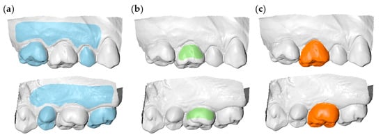 Superimposition reference areas for tooth wear assessment at a maxillary first permanent molar. (a) Gold standard area (GS, blue). (b) Partial crown area (PC, green). (c) Complete crown area (CC, orange). Buccal aspects are shown at the upper row and palatal aspects at the lower row.