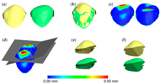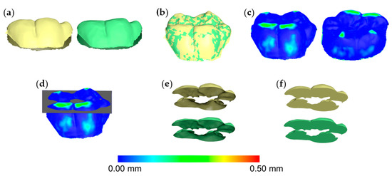 Workflow of tooth wear assessment in a mandibular first molar. (a) Tooth crown before (yellow) and after (green) wear simulation at the occlusal and the buccolingual surfaces. (b) Tooth crowns superimposed through the complete crown technique with setting D (30% estimated overlap). (c) Tooth wear from the buccal (left) and the lingual (right) aspect shown using a color coded distance map. (d) Simultaneous slicing of the two crowns using one level (grey). (e) Sliced tooth crown parts. (f) Watertight models created after the hole-filling process, used to calculate volumes.