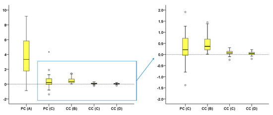 Tooth type affected the trueness and precision only of CC(B) technique (Mann–Whitney U test, p < 0.01), with molars showing slightly higher differences to the GS measurements (Figure 5a). Tooth alignment in the dental arches affected only the results of the PC(C) technique (Mann–Whitney U test: p < 0.01). Tooth wear amount affected significantly only the results of the CC(B) and CC(C) techniques (Kruskal–Wallis test, p < 0.01; Figure 5b), with differences from the GS measurements increased with increasing tooth wear amount.
