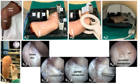 Standard arthroscopy was performed in-between the sequential MRI measurements (Figure 1(b1)) by SN (common trunk-trained orthopedic surgeon). Following access to the joint via standard anteromedial and anterolateral portals, the ACL was identified (Figure 1(b2)) and synovectomized for full visualization. For partial ACL transection during the first arthroscopy session, the ACL was cut at mid-substance level to approximately 50% of its cross-sectional diameter using arthroscopic straight-tip scissors (Arthrex) (Figure 1(b3)). No particular attention was directed at differentiating the ACL bundles. After partial transection, functional integrity of the remaining fibers was assessed by arthroscopic probing. During the second arthroscopy session, the ACL was completely transected (Figure 1(b4)). Once the procedure was completed, the joint was thoroughly irrigated, excess fluid removed, and portals sutured.