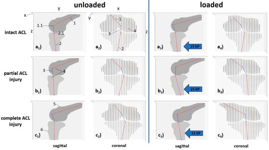 Visualization of 3D measures to quantify knee joint motion as a function of loading and ACL status (left knee joint). In this representative knee joint, unloaded (a1–c1,a2–c2) and loaded configurations (a3–c3,a4–c4) are displayed for the ACL-intact (a), partially (b) and completely ACL-deficient configurations (c). Femur and tibia are visualized along the y-z-plane (corresponding to the sagittal view, a1–c1,a3–c3,) and the x-z-plane (corresponding to the coronal view, a2–c2,a4–c4). Following manual segmentations of the femur (dark grey) and tibia (light grey) and delineation of the central bone axes (red), the femoral and tibial axis-bone-intersections (ABI) were computed (black crosses). Similarly, the centres of the tibial tuberosity and the tip of the cartilage-covered trochlea were manually identified (dark grey crosses). 3D Euclidean vectors connected the femoral and tibial axis-bone-intersections (dashed blue lines) and the anatomic landmarks (dashed orange lines). Blue block arrows indicate the direction of force applied to the proximal calf. Designated axes as given in a1 and a2 range from 0–30 (x-axis) and 0–448 (y- and z-axes) pixels, respectively. Sliced appearance of femur and tibia in (a2–c3,a4–c4) is due to interslice gaps after secondary reconstruction. 1—central femoral bone axis, 1.1—femoral axis-bone-intersection, 2—central tibial bone axis, 2.1—tibial axis-bone-intersection, 3—vector_ABI, 4—vector_landmarks, 5—tip of the cartilage-covered trochlea, 6—centre of the tibial tuberosity. Same knee joint specimen as in Figure 3, Figure 4 and Figure 5.