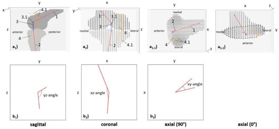 Detailed quantification of 3D measures to quantify knee joint motion (left knee joint). Femur (dark grey) and tibia (light grey) are visualized along the y-z (a1), x-z (a2), and x-y planes (a3). Red lines give central bone axes, black crosses the intersections of central bone axes and bone, grey crosses the anatomic landmarks, i.e., the tip of the cartilage-covered femoral trochlea and the centre of the tibial tuberosity, dashed blue lines the vectors between the axis-bone-intersections, and dashed orange lines the vectors between the anatomic landmarks. Besides vector magnitudes (”length_ABI” [dashed blue lines]; ”length_landmarks” [dashed orange line]), vector projections along the x-, y-, and z-axes were quantified as “x_ABI”, “y_ABI”, “z_ABI” (solid blue lines) or “x_landmarks”, “y_landmarks”, and “z_landmarks” (solid orange lines). Positive values for the measure along the x-, y-, and z-axis indicate a more lateral, posterior, and proximal position of the femoral point as compared to the tibial point. Axial views are visualized in 90° (a3.1) and 0° rotation (a3.2). Due to significant overlap and obscured delineation of femur and tibia (a3.1), the tibial contours are indicated by black dots (a3.2). Following their projections onto the yz- (b1, “sagittal”), xz- (b2, “coronal”), and xy-planes (b3, “axial”), angles between the femoral and tibial central bone axes were quantified, as well. In this exemplary knee joint configuration (ACL-intact δ0-configuration), the angles were quantified as yz = 113°, xz = 175°, and xy = 41°. For yz-angles, large values close to 180° indicate nearly full extension of the knee joint, while lower angles between 180° and 90° indicate increasing knee joint flexion angles and an yz-angle of 90° the perpendicular orientation of the central bone axes in the sagittal plane. For xz-angles, large values close to 180° indicate nearly parallel orientations of the femoral and tibial central bone axes, while values close to 90° indicate nearly right-angled orientations. By convention, xz-angles were defined as the medial-sided angles between the central bone axes in the coronal plane. For xy-angles, values close to 0° indicate nearly parallel orientations of the central bone axes in the axial plane, while increasing xy-angles indicate increasing external rotation. Of note, as projective measures, these angles are prone to cross-plane effects introduced by coronal, sagittal, and axial alignment. 1—central femoral bone axis, 2—central tibial bone axis, 3—vector_ABI, 3.1—vector projections of vector_ABI, 4—vector_landmarks, 4.1—vector projections of vector_landmarks. Same knee joint specimen as in Figure 2, Figure 4 and Figure 5.