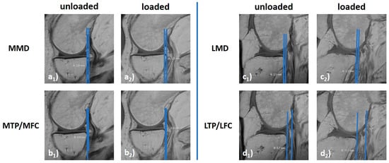 Exemplary manual measures to quantify knee joint motion. For the medial (a,b) and lateral (c,d) femorotibial compartments, loading-induced anterior translation of the tibia was quantified relative to the posterior horns of the menisci (MMD [a], LMD [c]) and the femoral condyles (MTP/MFC [b], LTP/LFC [d]). Unloaded (a1–d1) and loaded configurations (a2–d2). MMD and LMD quantify the respective femorotibial compartment’s horizontal distance between the tangential lines at the base of the meniscus’ posterior horn and the posterior margin of the tibial plateau’s articular surface. Positive values indicate a more anterior position of the posterior horn relative to the tibial plateau, while negative values indicate a more posterior position. MTP/MFC and LTP/LFC give the horizontal distance between tangential lines to the posterior margins of the femoral condyle and the tibial plateau’s articular surface. Positive values indicate a more anterior position of the femoral condyle relative to the tibial plateau, while negative values indicate a more posterior position. [mm]. Same knee joint specimen as in Figure 2, Figure 3 and Figure 5 (ACL-intact δ0-configuration).