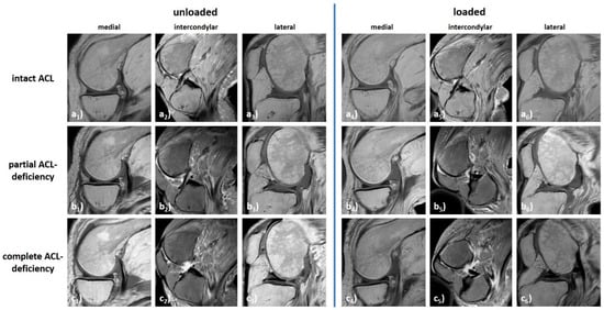 Synopsis of loading-induced changes in a representative knee joint specimen as a function of loading and ACL status. Displayed are T1-weighted sagittal sequences through the centres of the medial (a1–c1,a4–c4) and lateral (a3–c3,a6–c6) femorotibial compartments as well as T2-weighted para-sagittal sequences aligned along the ACL (a2–c2,a5–c5). Unloaded (a1–a3,b1–b3,c1–c4) and loaded configurations (a4–a6,b4–b6,c4–c6). ACL-intact (a), partially ACL-deficient (b), and completely ACL-deficient conditions (c). Same knee joint specimen as in Figure 2, Figure 3 and Figure 4.