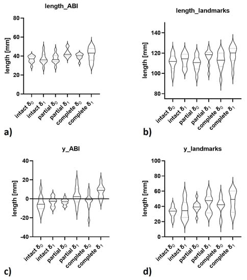 Visualizations of selected computed 3D measures of joint motion as a function of ACL status and loading. Visualized are “length_ABI” (a), “length_landmarks” (b), “y_ABI” (c), and “y_landmarks” (d) as violin plots where quartiles are indicated by dotted lines and medians by continuous lines. δ0 and δ1 refer to the loading configuration and intact, partial, and complete to the ACL condition.
